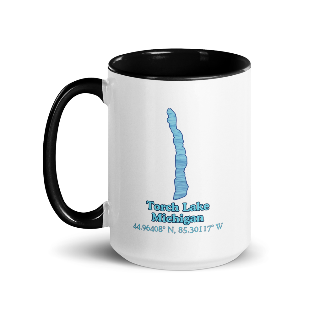 This 15 oz ceramic mug has a colorful rim and handle with Torch Lake and the playful "We Lake You" message on the other side. Its durable ceramic material ensures long-lasting use, and the print retains its quality and luster when used in both microwaves and the dishwasher. 15 oz Mug Dimensions: 4.69″ (11.9 cm) in height, 3.35″ (8.5 cm) in diameter.