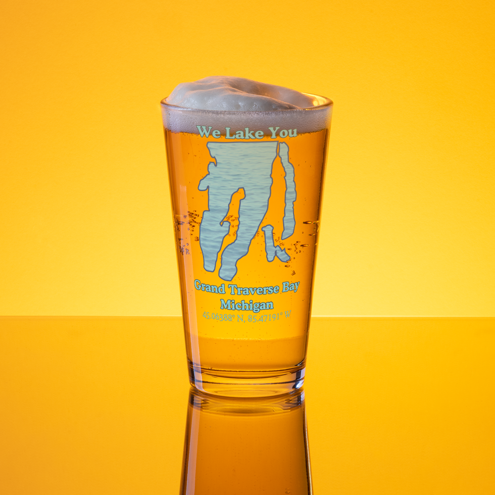 You can almost taste your beverage of choice in this 16 oz pint glass featuring Grand Traverse Bay with the "We Lake You" message on one side. It is a durable, high-quality addition to any glassware collection. Perfect gift for lake house guests to show their appreciation for the invite. Hand-washing recommended to insure the high-quality raised artwork is preserved for a long time. Dishwasher is OK now and then, but do not put glass in microwave. Note: The bubbles in the photo are from the beverage - not part of the design.