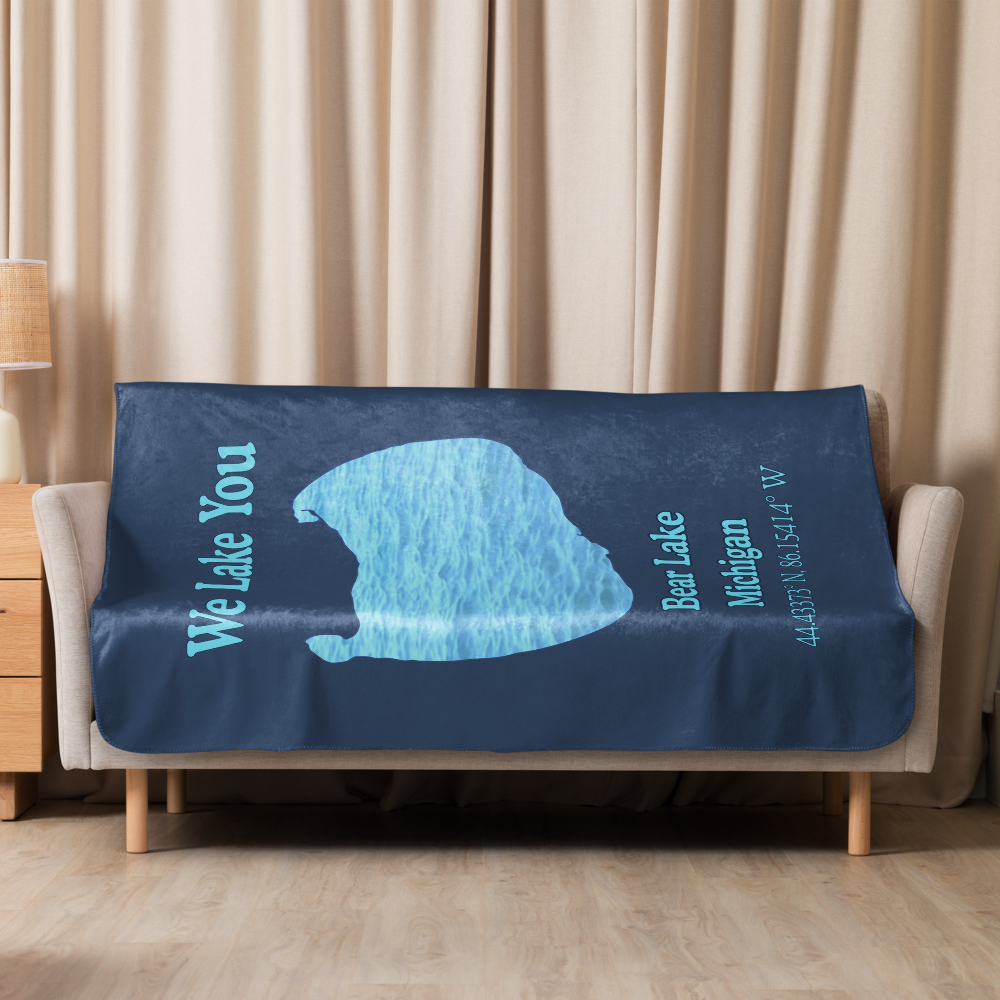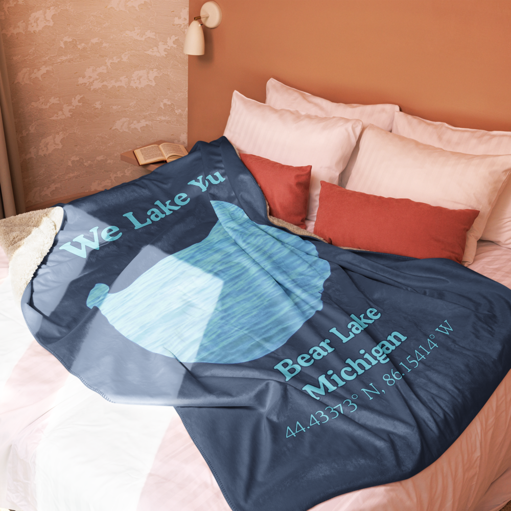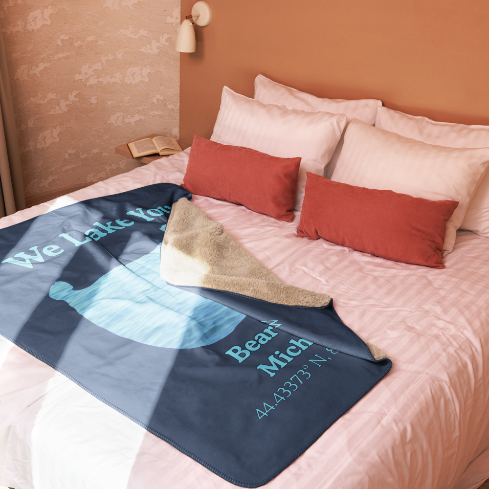 This exquisite sherpa blanket features a Bear Lake design with a welcoming 'We Lake You' declaration. It combines a plushie feel with exceptional softness - making it perfect for lounging, snuggling or styling your guest room at the lake house. Available in two sizes: 50" x 60" (127 x 153 cm) and 60" x 80" (153 x 203 cm). Fabric is 100% polyester (51.5% surface fabric, 48.5% sherpa fabric)
