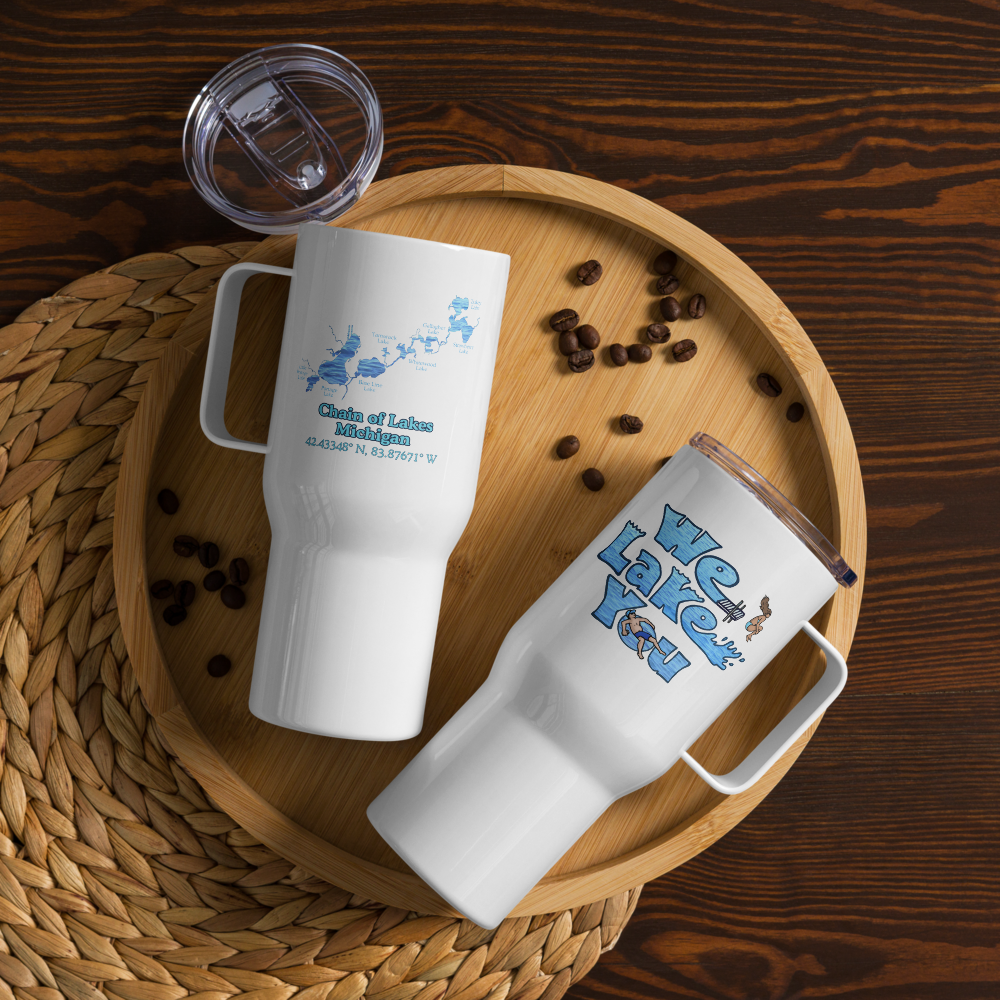 Sip in style with this sleek and durable 25 oz Travel Mug featuring Chain of Lakes on front and We Lake You on other side. It's perfect for taking out on the boat and fits into most car cup holders. With its spill-proof plastic lid, this travel mug will keep your beverage safe and at just the right temperature. Dishwashing is OK but hand-washing best preserves the high-quality artwork for years to come. Do not put stainless steel in a microwave.