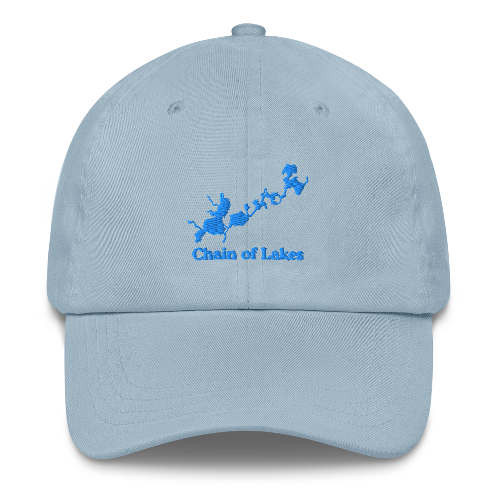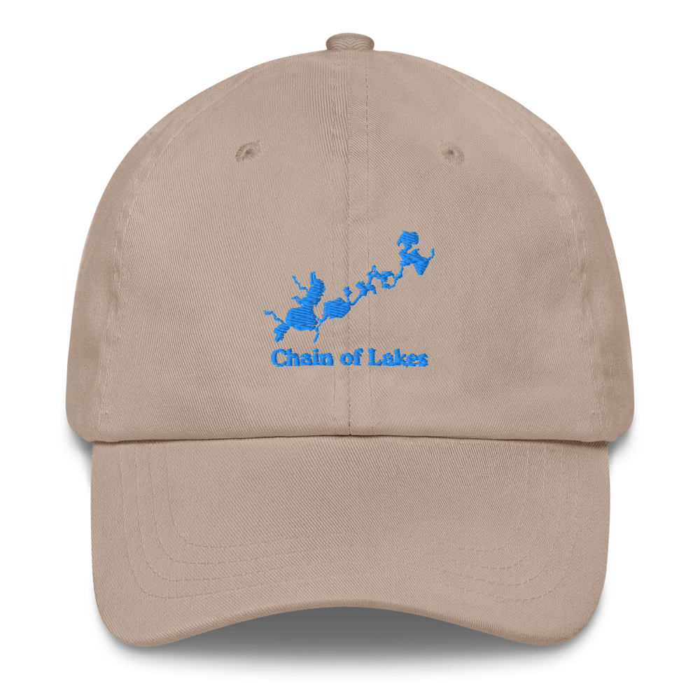 These hats aren't just for Dads and Celebrities. The embroidered Chain of Lakes artwork on front and "We Lake You" on back is sure to turn heads. The adjustable back strap with antique buckle gives it a comfortable fit all day long. Made of 100% chino cotton twill, it has a curved visor, 6 embroidered eyelets, 3 ⅛” (7.6 cm) crown. One size fits most.