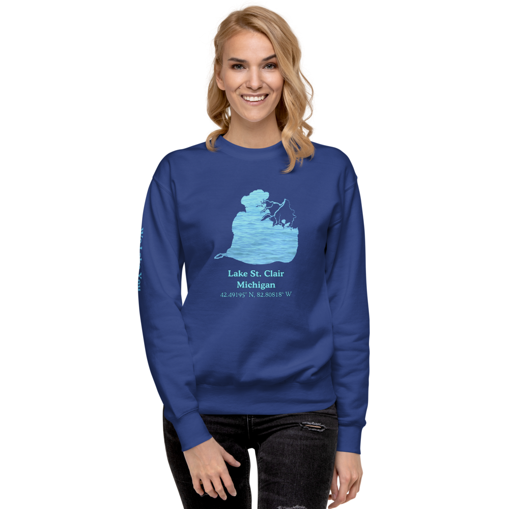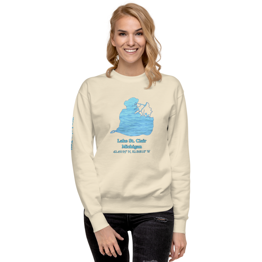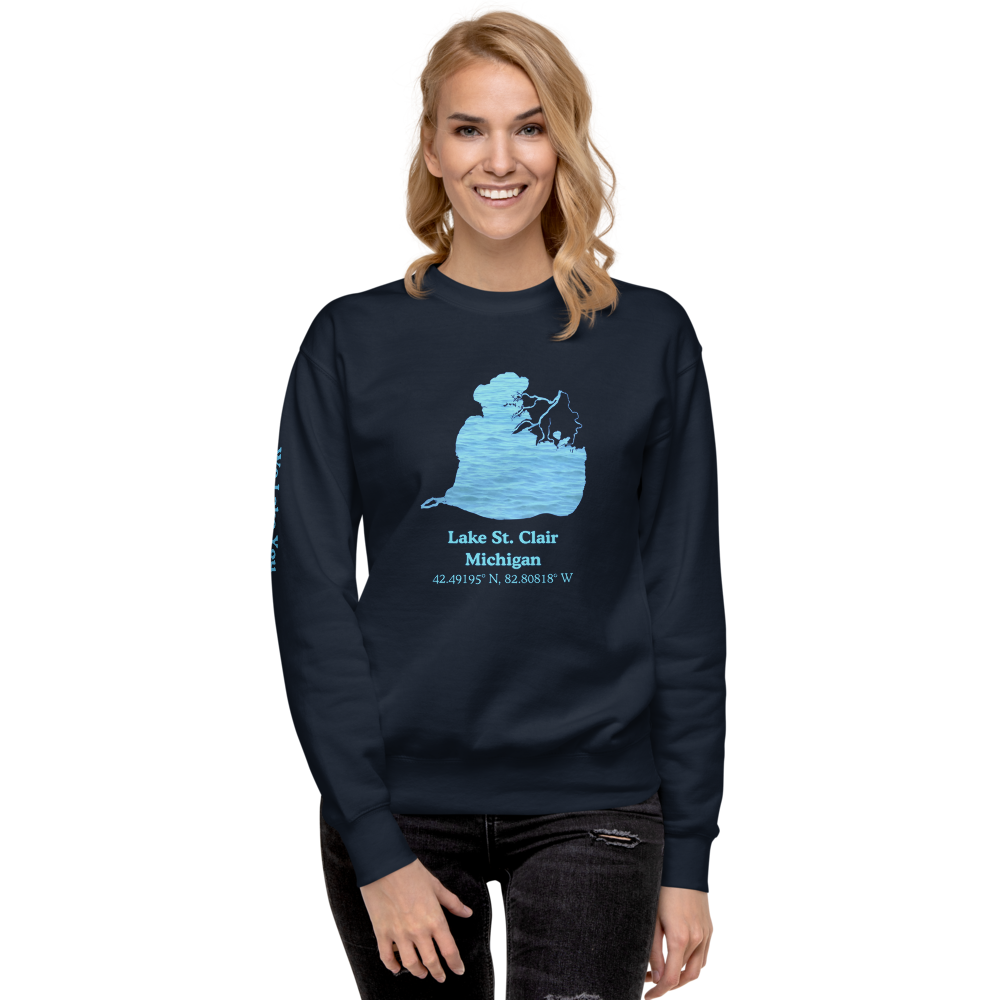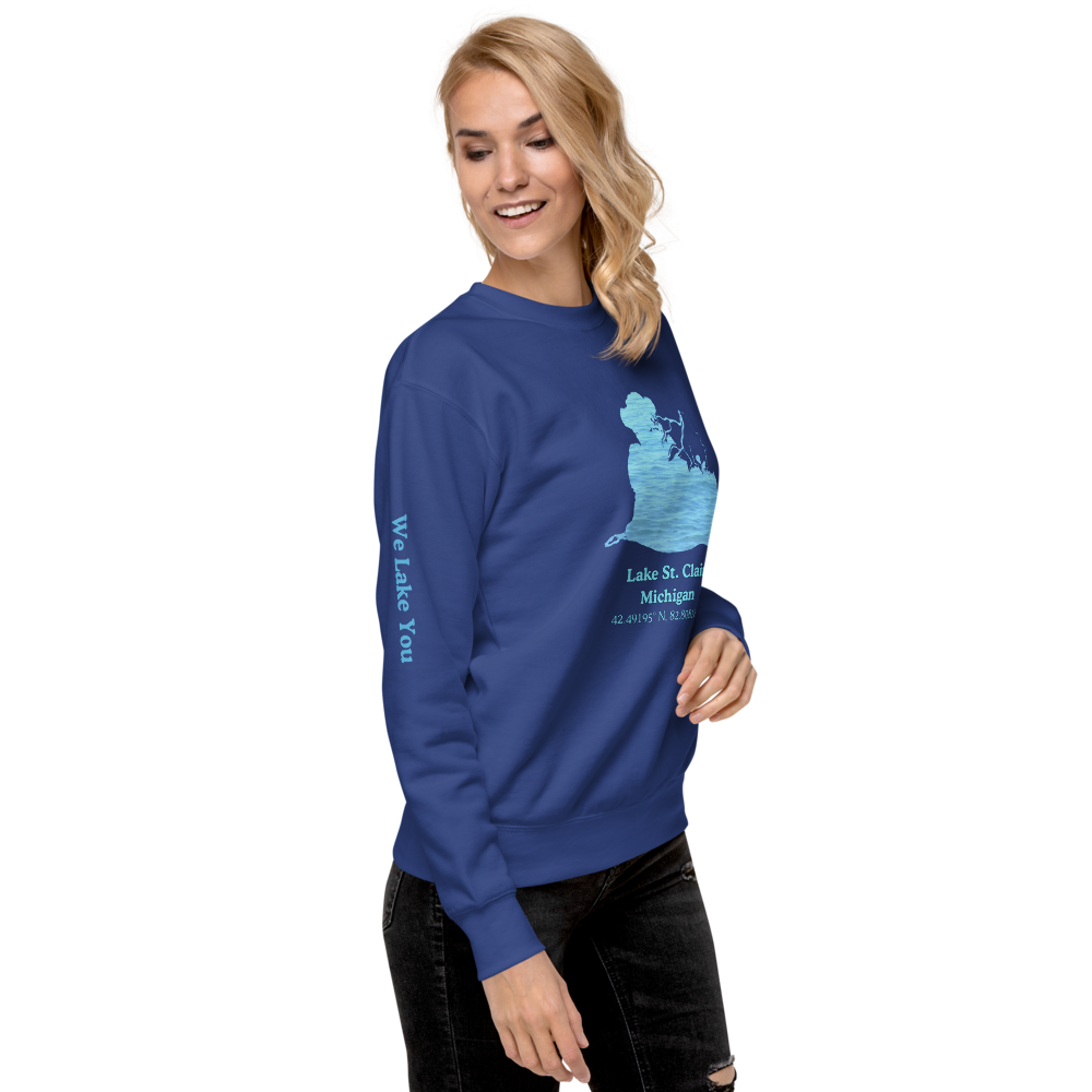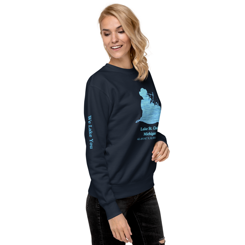 This cozy unisex premium sweatshirt has Lake St. Clair displayed on the front and 'We Lake You' down the sleeve. Its super soft fleece inside lining and form-fitting design will likely make it that piece of clothing you wear too much! *PLEASE NOTE* Because these sweatshirts are designed to fit snugly, we strongly recommend ORDERING ONE SIZE LARGER than your usual size for a more relaxed fit.