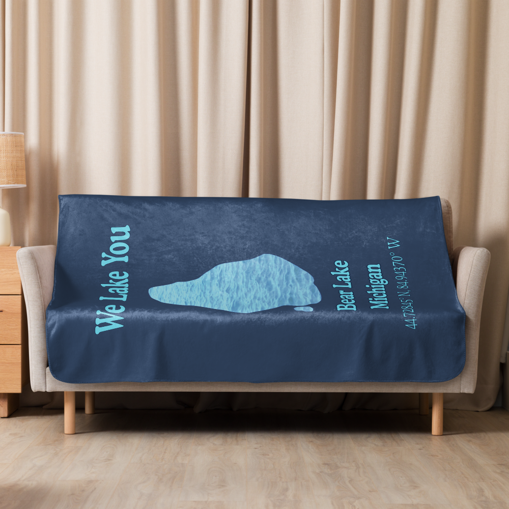 This exquisite sherpa blanket features a Bear Lake design with a welcoming 'We Lake You' declaration. It combines a plushie feel with exceptional softness - making it perfect for lounging, snuggling or styling your guest room at the lake house.  Available in two sizes:  50" x 60" (127 x 153 cm) and 60" x 80" (153 x 203 cm).  Fabric is 100% polyester (51.5% surface fabric, 48.5% sherpa fabric)