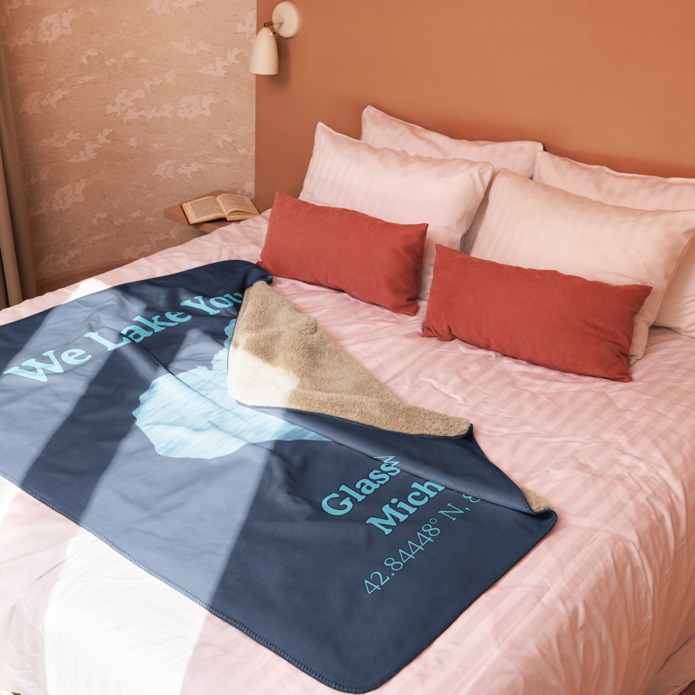 This exquisite sherpa blanket features a Glass Lake design with a welcoming 'We Lake You' declaration. It combines a plushie feel with exceptional softness - making it perfect for lounging, snuggling or styling your guest room at the lake house. Available in two sizes: 50" x 60" (127 x 153 cm) and 60" x 80" (153 x 203 cm). Fabric is 100% polyester (51.5% surface fabric, 48.5% sherpa fabric)