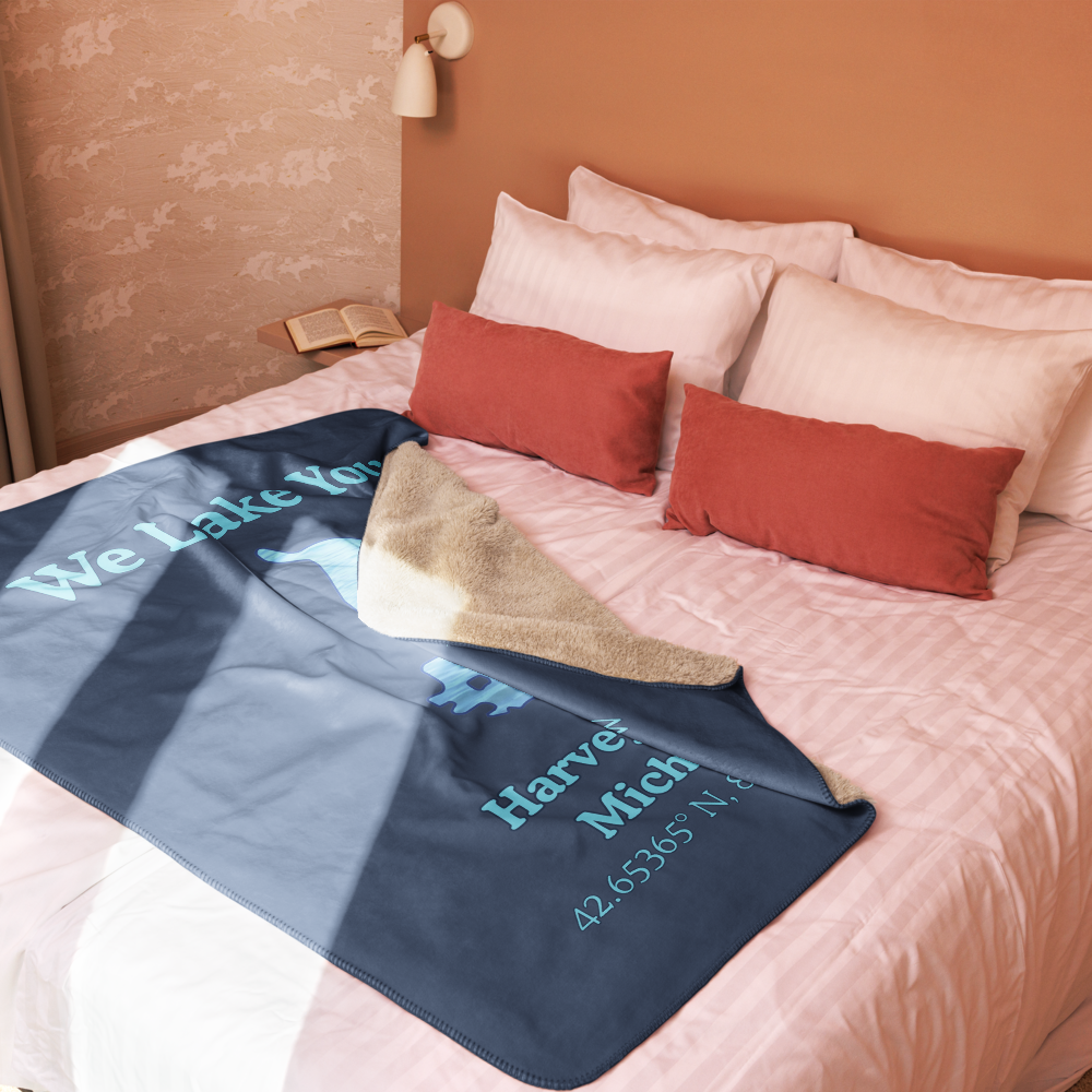 This exquisite sherpa blanket features a Harvey Lake design with a welcoming 'We Lake You' declaration. It combines a plushie feel with exceptional softness - making it perfect for lounging, snuggling or styling your guest room at the lake house. Available in two sizes: 50" x 60" (127 x 153 cm) and 60" x 80" (153 x 203 cm). Fabric is 100% polyester (51.5% surface fabric, 48.5% sherpa fabric)