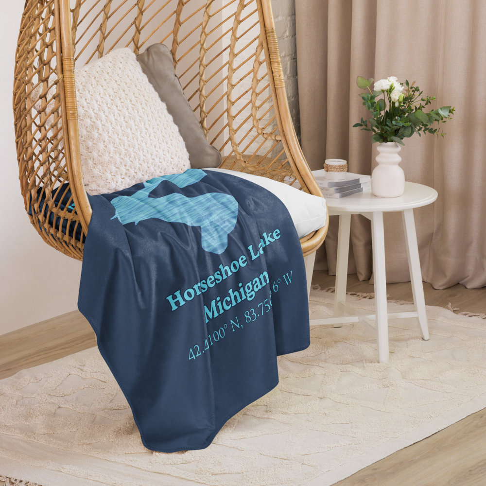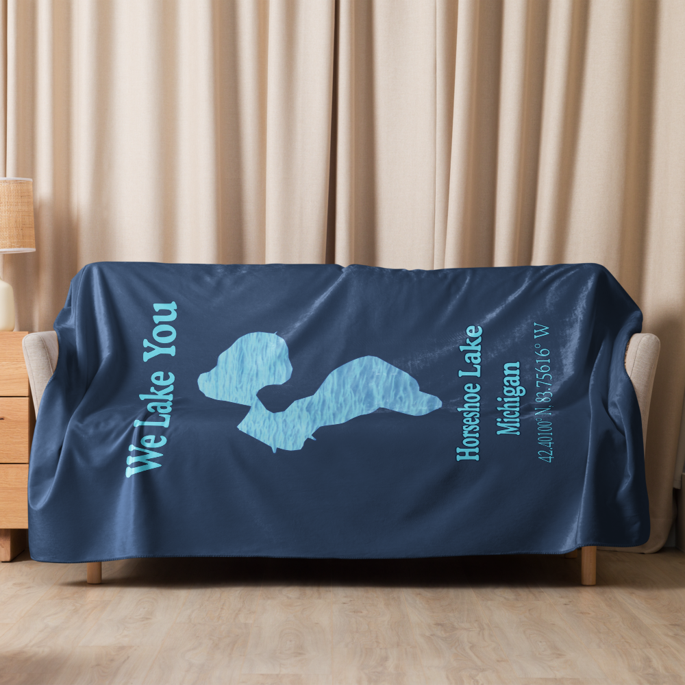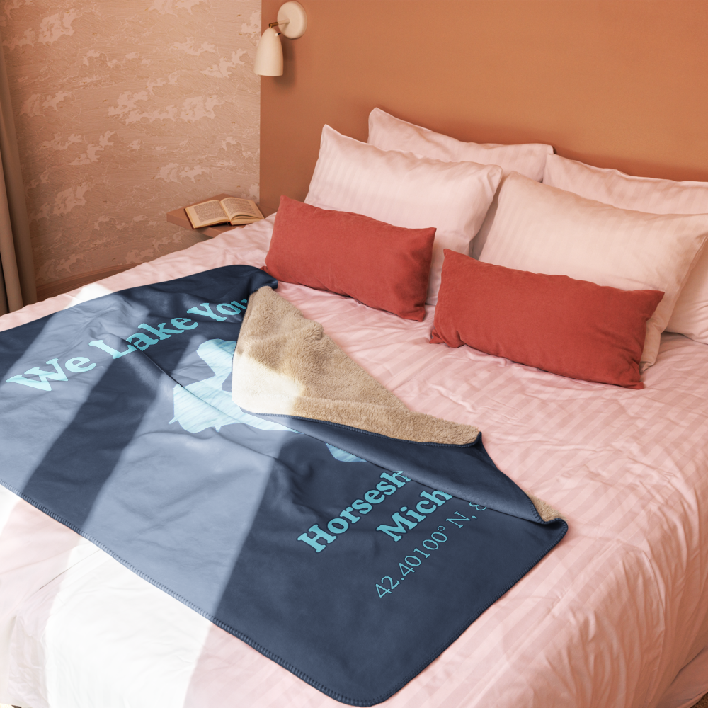 This exquisite sherpa blanket features a Horseshoe Lake design with a welcoming 'We Lake You' declaration. It combines a plushie feel with exceptional softness - making it perfect for lounging, snuggling or styling your guest room at the lake house. Available in two sizes: 50" x 60" (127 x 153 cm) and 60" x 80" (153 x 203 cm). Fabric is 100% polyester (51.5% surface fabric, 48.5% sherpa fabric)