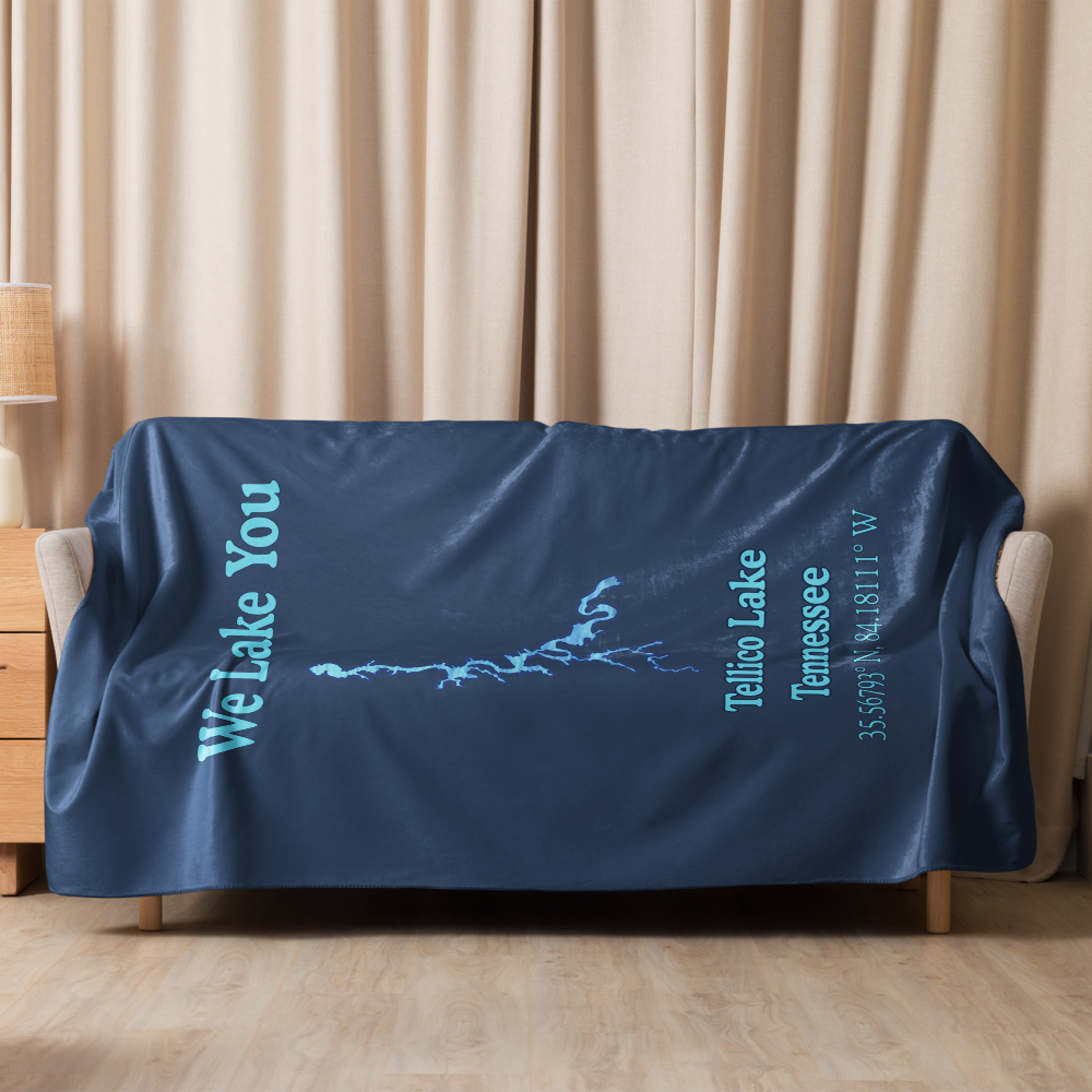 This exquisite sherpa blanket features a Tellico Lake design with a welcoming 'We Lake You' declaration. It combines a plushie feel with exceptional softness - making it perfect for lounging, snuggling or styling your guest room at the lake house. Available in two sizes: 50" x 60" (127 x 153 cm) and 60" x 80" (153 x 203 cm). Fabric is 100% polyester (51.5% surface fabric, 48.5% sherpa fabric)