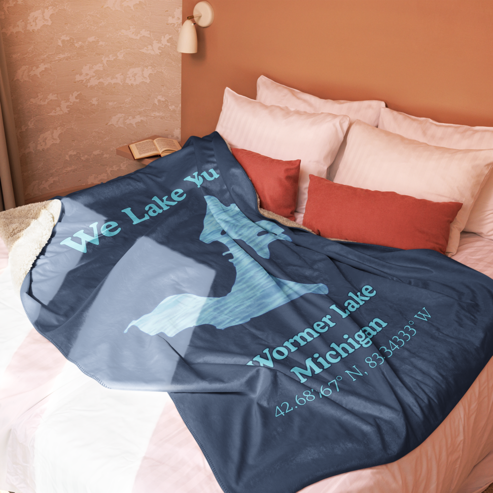 This exquisite sherpa blanket features a Wormer Lake design with a welcoming 'We Lake You' declaration. It combines a plushie feel with exceptional softness - making it perfect for lounging, snuggling or styling your guest room at the lake house. Available in two sizes: 50" x 60" (127 x 153 cm) and 60" x 80" (153 x 203 cm). Fabric is 100% polyester (51.5% surface fabric, 48.5% sherpa fabric)