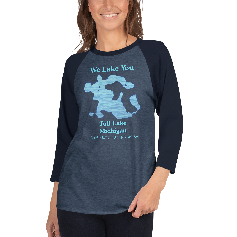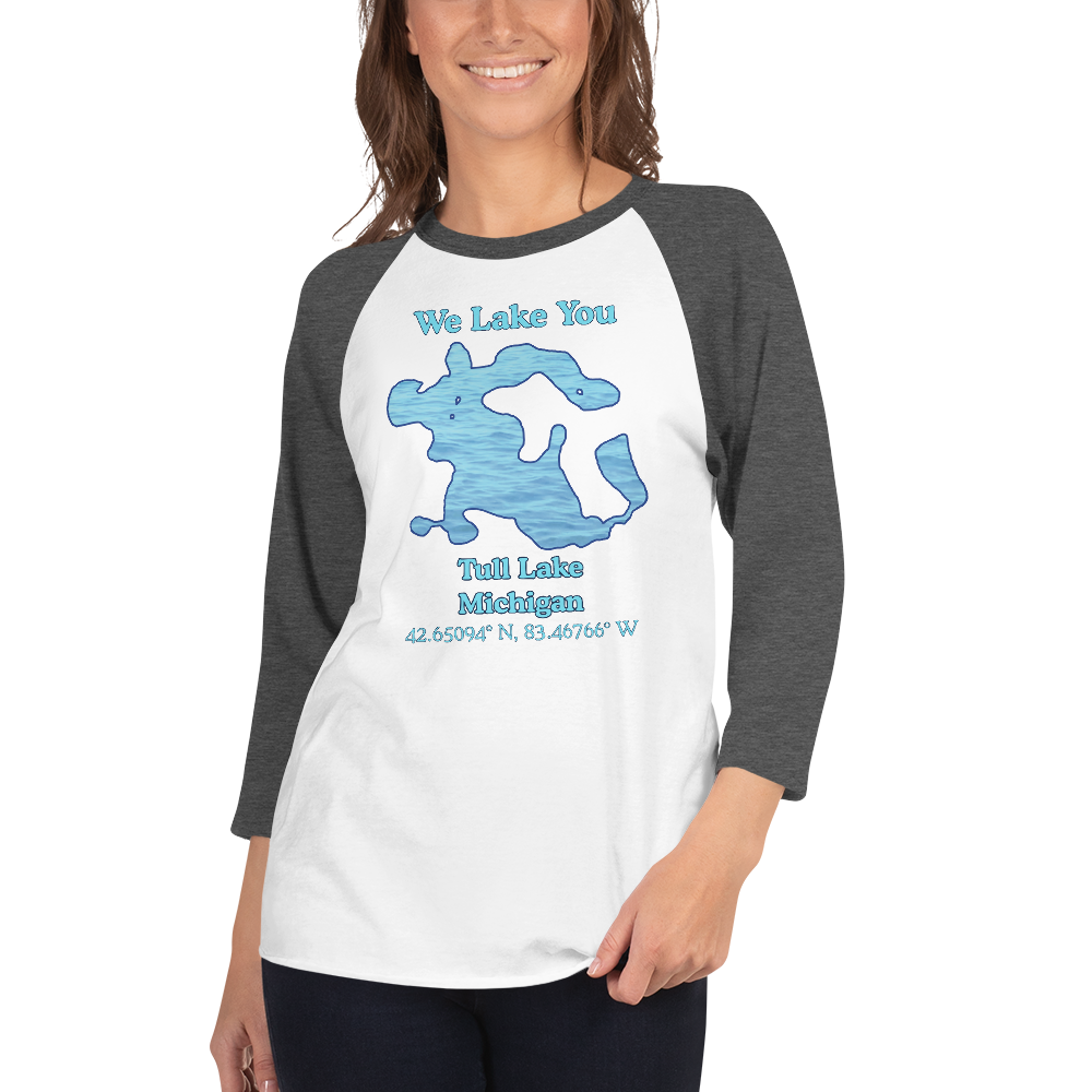 This classic t-shirt with raglan 3/4 sleeves makes you think of the Bad News Bears going to the lake. With Tull Lake and "We Lake You" both featured on the front - who doesn't want to be on that team? It is delightfully light weight and has super soft blends of combed and ring-spun cotton. The contrasting sleeves and t-shirt colors make the beauty of Tull Lake stand out!