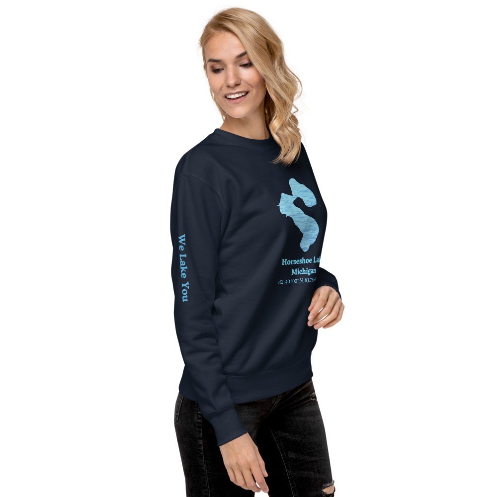 This cozy unisex premium sweatshirt has Horseshoe Lake displayed on the front and 'We Lake You' down the sleeve. Its super soft fleece inside lining and form-fitting design will likely make it that piece of clothing you wear too much! *PLEASE NOTE* Because these sweatshirts are designed to fit snugly, we strongly recommend ORDERING ONE SIZE LARGER than your usual size for a more relaxed fit.